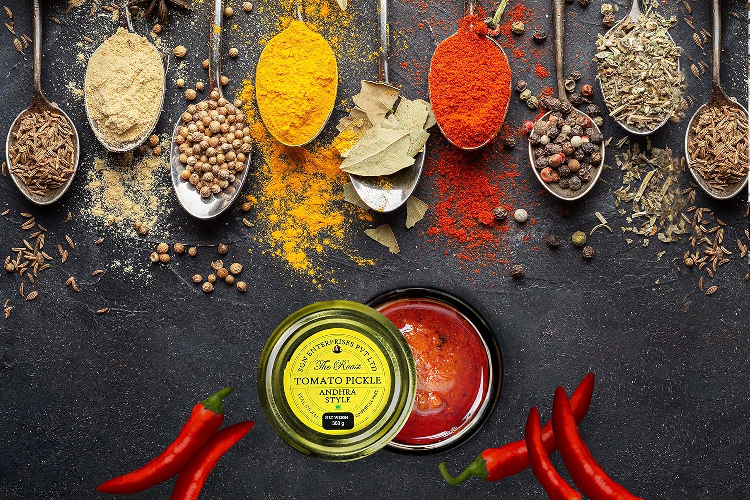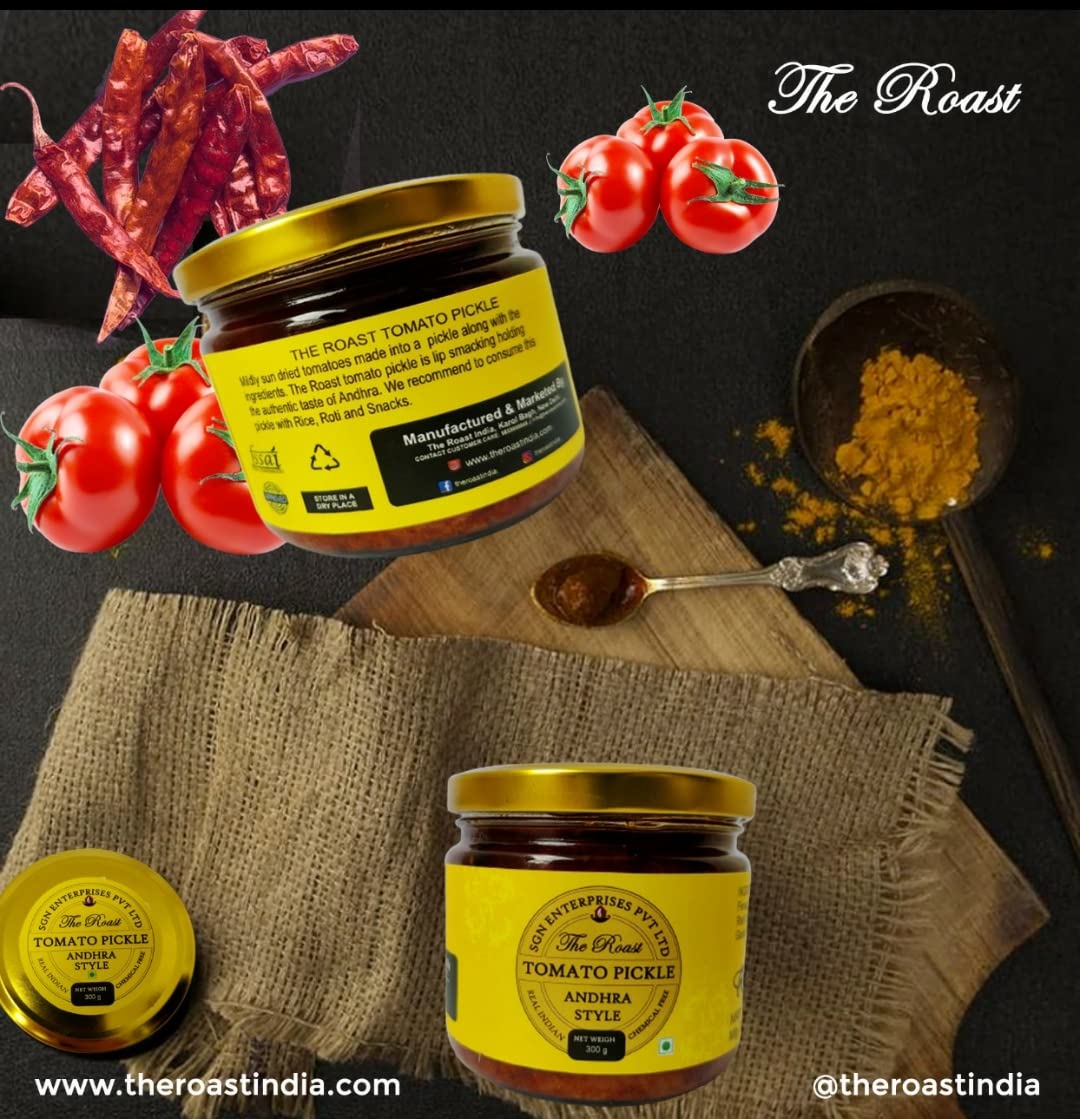Experience the bold and fiery flavors of South India with The Roast Andhra Style Tomato Pickle—a perfect blend of tradition, taste, and health. Made using fresh, sun-ripened tomatoes, this pickle captures the true essence of Andhra cuisine, known for its spicy, tangy, and irresistibly aromatic delights. Each jar is carefully crafted using 100% natural ingredients, with no added preservatives, artificial flavors, or colors, ensuring you enjoy a wholesome and authentic taste with every bite.