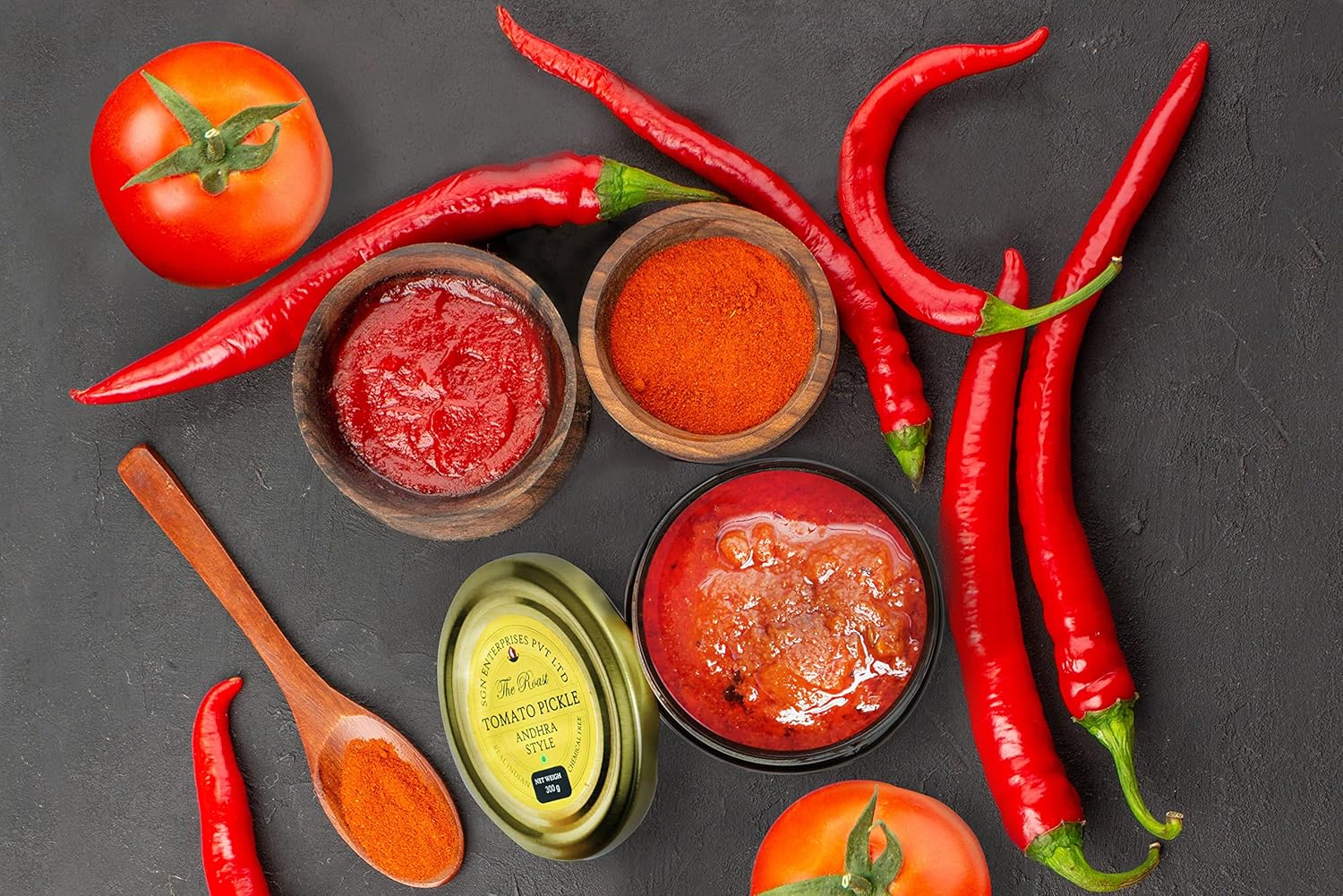Prepared using a time-honored recipe, this pickle combines juicy tomatoes with cold-pressed sesame oil, garlic, mustard seeds, curry leaves, and handpicked spices. The result is a rich, deep flavor that pairs beautifully with rice, idli, dosa, chapati, curd rice, or even as a side with snacks. Its perfect balance of spice and tanginess makes it a versatile condiment that complements both traditional and modern meals.
